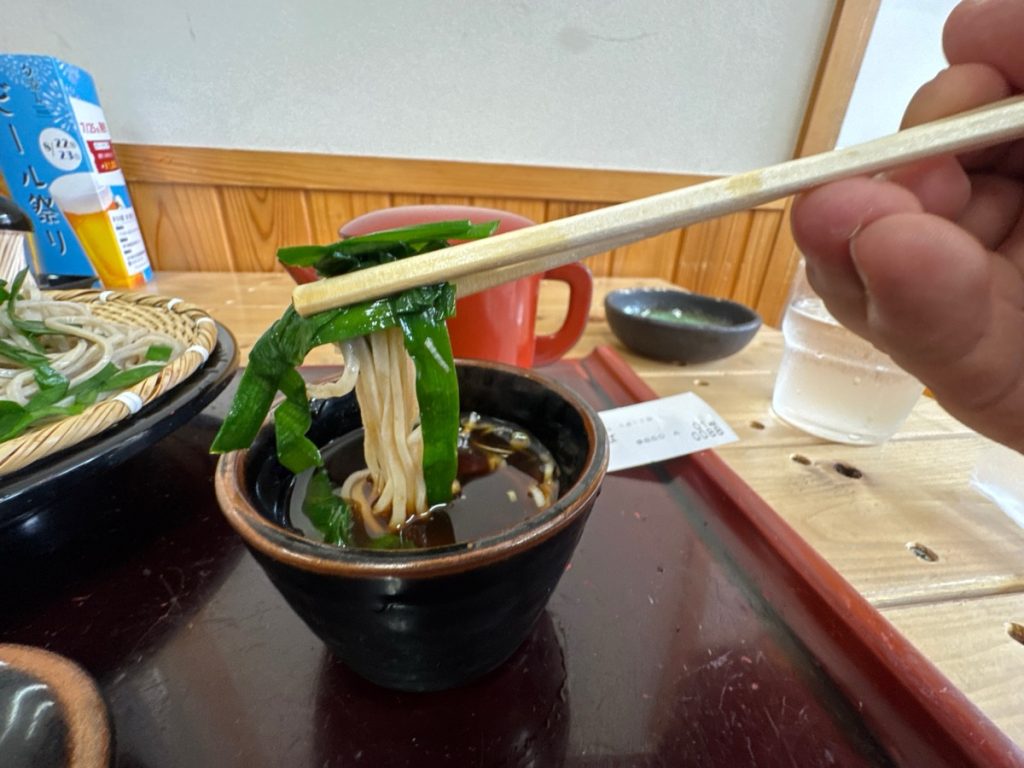 そばはこれまで食べた中でも一番と言えるほどの強いコシと歯応え。つゆにつけると、甘みと旨味がニラとそばを一層引き立てます。