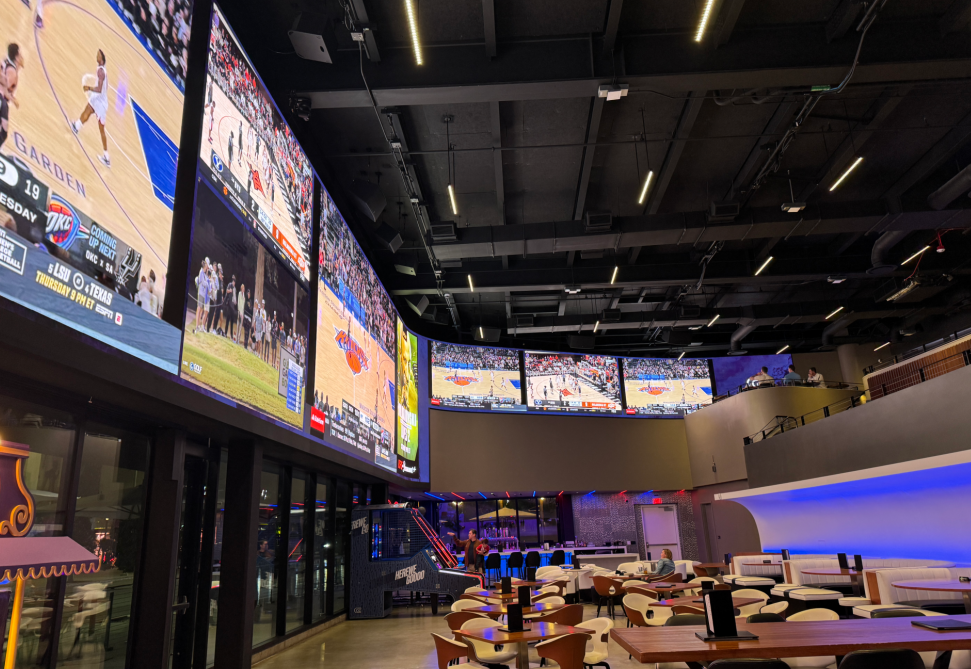 これは、超大型スクリーンでスポーツ観戦や映画などを楽しみながら、ご飯やお酒も楽しめる新しい観戦体験施設です。
